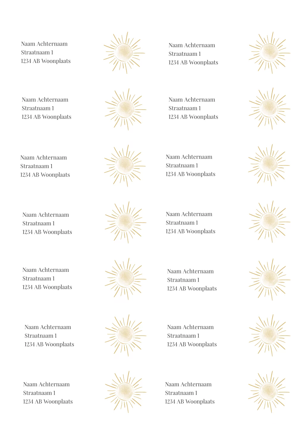 Mooie neutrale adresstickers in stijl van het geboortekaartje voor je kindje met een zon. Je kan het ontwerp zelf aanpassen en je plaatst heel eenvoudig zelf alle adressen op de adresstickers.