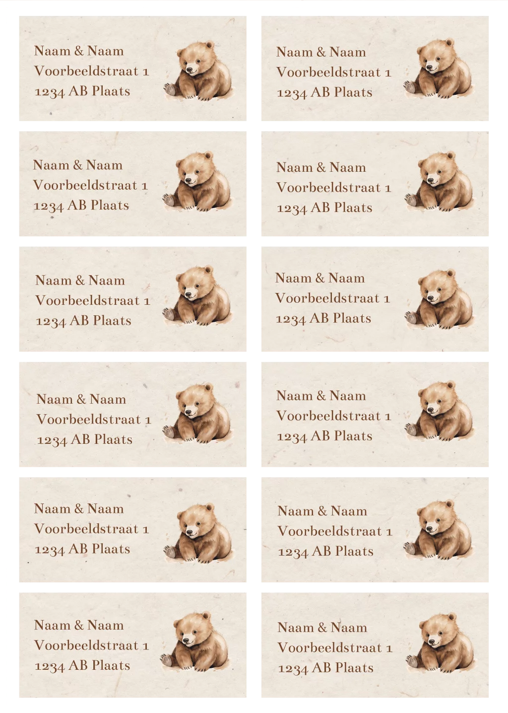 Neutrale adresstickers met een vezellook achtergrond en een lief beertje. Het ontwerp van de stickers kan helemaal naar wens aangepast worden in onze online editor. Ook kunnen daar de juiste adressen ingevuld worden. Ieder vel bevat twaalf adresstickers. je kan ook de adressen verwijderen en deze handmatig schrijven.