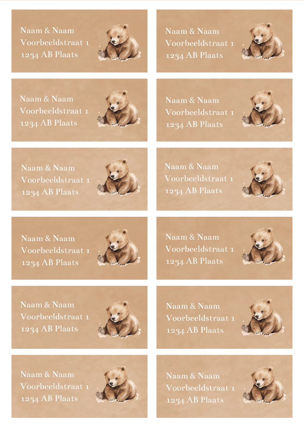 Deze adresstickers hebben een neutrale watercolour achtergrond en een lief beertje. Het ontwerp van de stickers kan helemaal naar wens aangepast worden in onze online editor. Ook kunnen daar de juiste adressen ingevuld worden. Ieder vel bevat twaalf adresstickers. je kan ook de adressen verwijderen en deze handmatig schrijven.