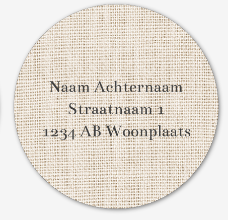 Deze ronde adressticker met linnen achtergrond past mooi bij een minimalistisch geboortekaartje.Je kan het ontwerp zelf aanpassen en je plaatst heel eenvoudig zelf alle adressen op de adresstickers.