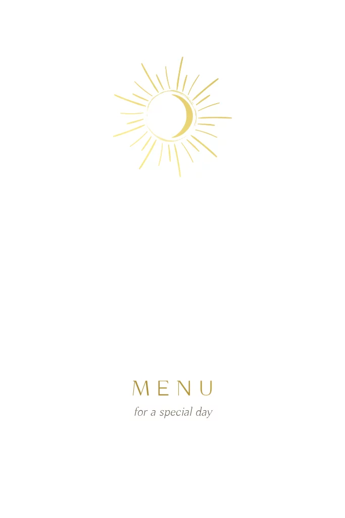 Luxe menukaart in originele vorm met goudfolie zon en maan. Deze bijzondere menukaart is mooi te combineren met de bijpassende Safe the Date kaart en maak de dag compleet met de huisstijl trouwkaart, naamkaart en bedankje. Wil je liever koperfolie of een andere achtergrondkleur? dat is eenvoudig aan te passen in de ontwerptool. Hulp nodig? Neem gerust contact op.