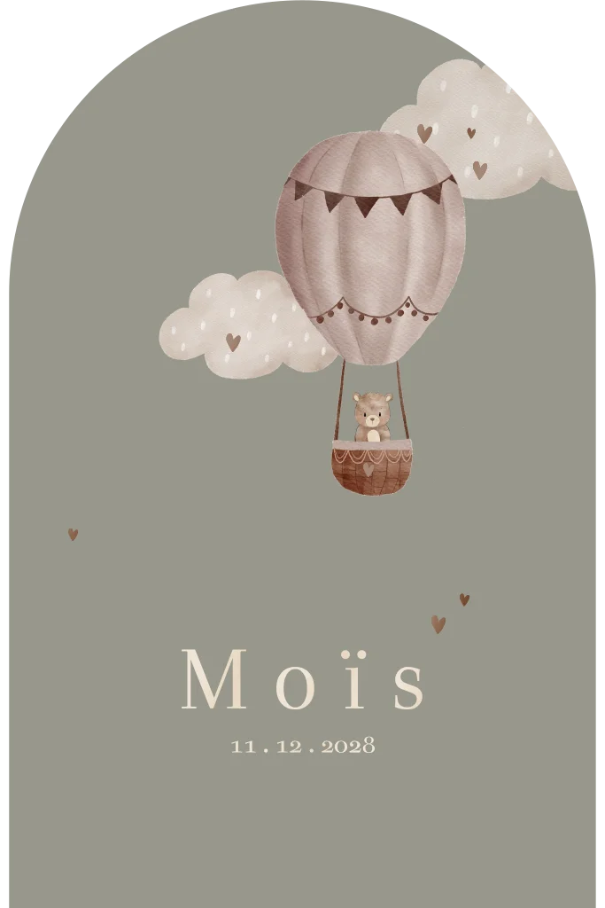 Stoer geboortekaartje voor een jongen met luchtballon en een beertje op een groene achtergrond. Met op de achterkant een lief beertje met maantje en een geboortegedichtje . De teksten en hoogglans folie kleur kan je zelf eenvoudig aanpassen in de editor. Verstuur je geboortekaartje extra feestelijk met een bijpassende sluitzegel en een raambord in boogvorm als aankondiging van de geboorte van jullie zoon.