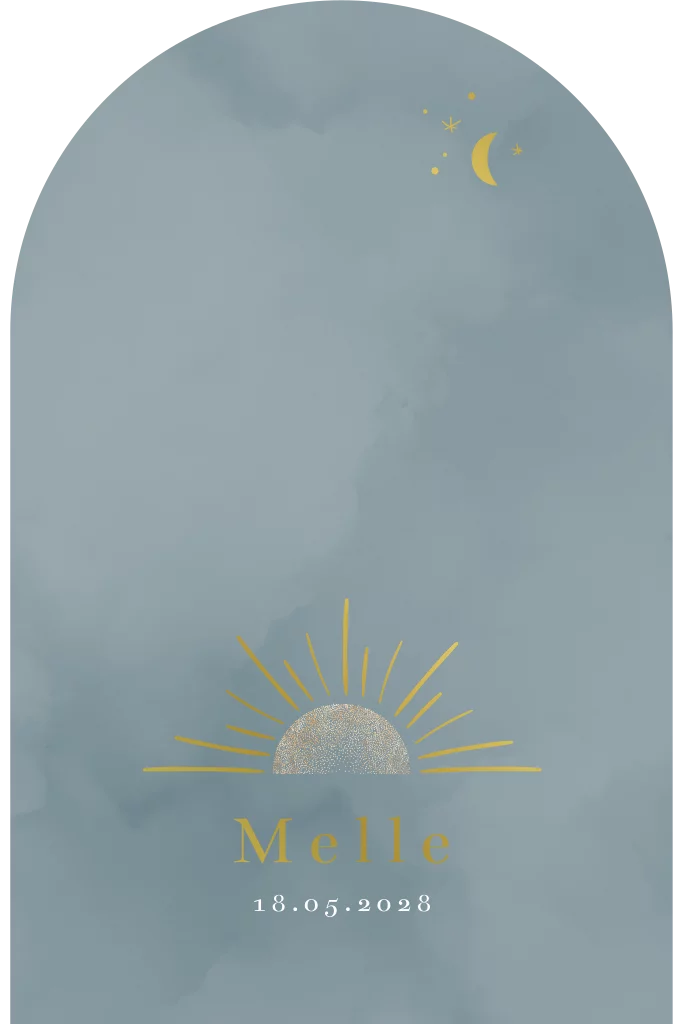 Neutraal geboortekaartje voor een jongen in een originele vorm met een mooie zon in goudfolie. de achtergrondkleur is eenvoudig aan te passen. lief geboortegedichtje op de achterkant.