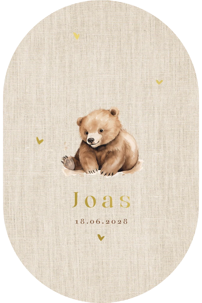 Stoer en lief geboortekaartje voor een jongen met goudfolie op linnen. Met beertje en hartjes op de voorkant. Je kan eenvoudig zelf de folie kleur en de details aanpassen in onze ontwerp tool. Leuk om te combineren met een bijpassende sluitzegel en een geboortebord om feestelijk de geboorte van je zoon aan te kondigen.
