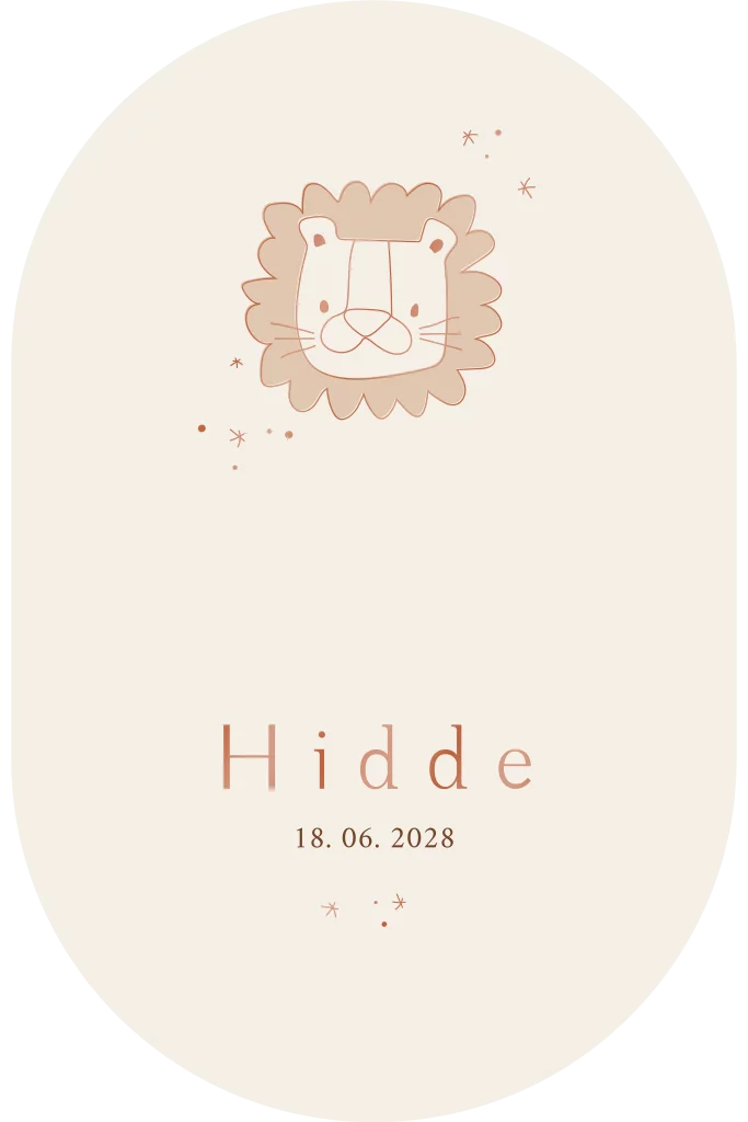 Stoer geboortekaartje voor een jongen met een originele stans vorm. De hoogglans folie leeuw is stoer en uniek. Op de achterkant staat deze illustratie als lijntekening. Met neutrale kleur achtergrond voor een minimalistische stoer geboortekaartje. Je kan eenvoudig zelf alle details aanpassen. Bestel een raambord om de geboorte van je kindje aan te kondigen in dezelfde stijl als het kaartje.