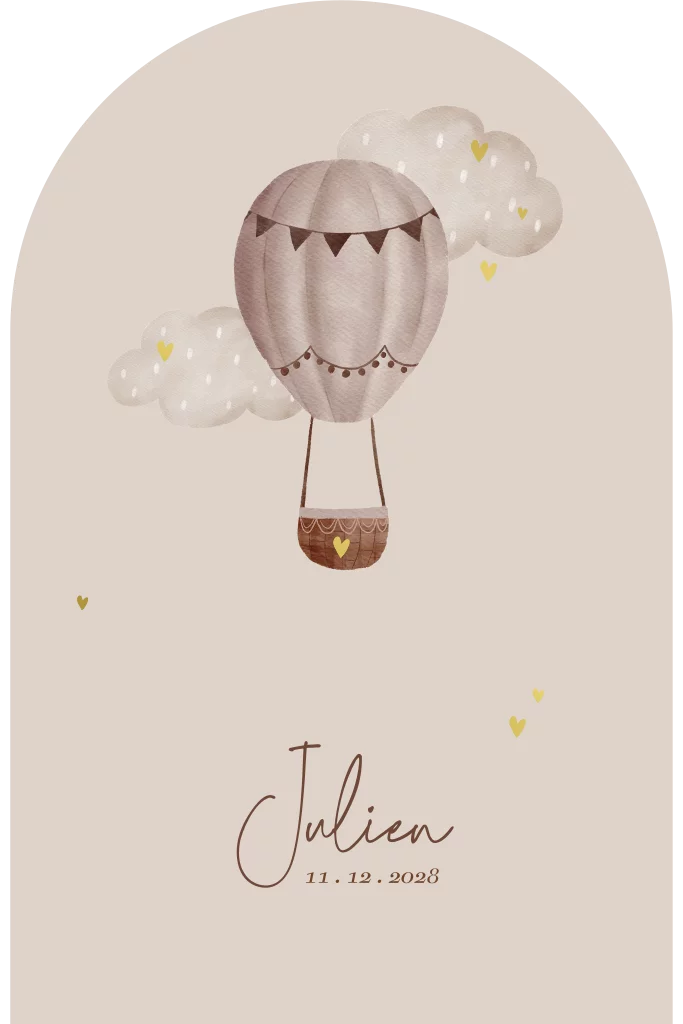Stoer geboortekaartje voor een jongen met een hippe luchtballon en goudfolie hartjes. De neutrale achtergrond past mooi bij de ballon en de originele boogvorm. Op de achterkant staat een geboortegedichtje en de teksten kan je zelf eenvoudig aanpassen in de editor. Verstuur je geboortekaartje extra feestelijk met een bijpassende sluitzegel en een raambord als aankondiging van de geboorte van jullie zoon.
