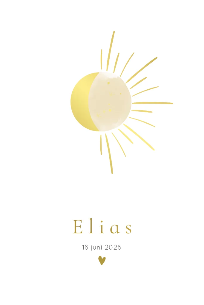 Bijzonder geboortekaartje voor een jongen met een originele stansvorm. De goudfolie maan en zon met sterretjes op de voorkant is prachtig en uniek. Extra feestelijk met een bijpassend raambord en leuk om het geboortekaartje te versturen met een sluitzegel in dezelfde stijl.