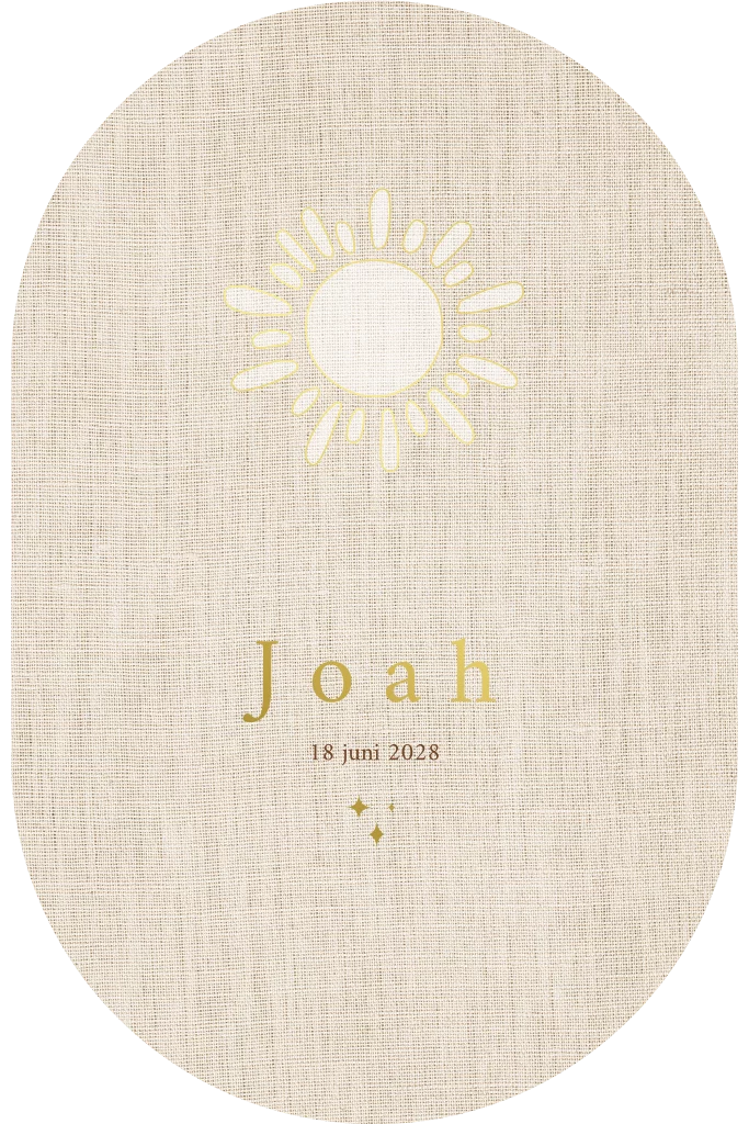 Bijzonder geboortekaartje voor een jongen met een originele stansvorm. De goudfolie zon en sterretjes geeft een luxe uitstraling aan dit neutrale geboortekaartje. Wil je liever een ander formaat ? neem dan gerust contact met ons op en wij zetten die klaar in je account. Extra feestelijke aankondiging met een raambord passend bij het geboortekaartje en natuurlijk een sluitzegel voor de envelop.