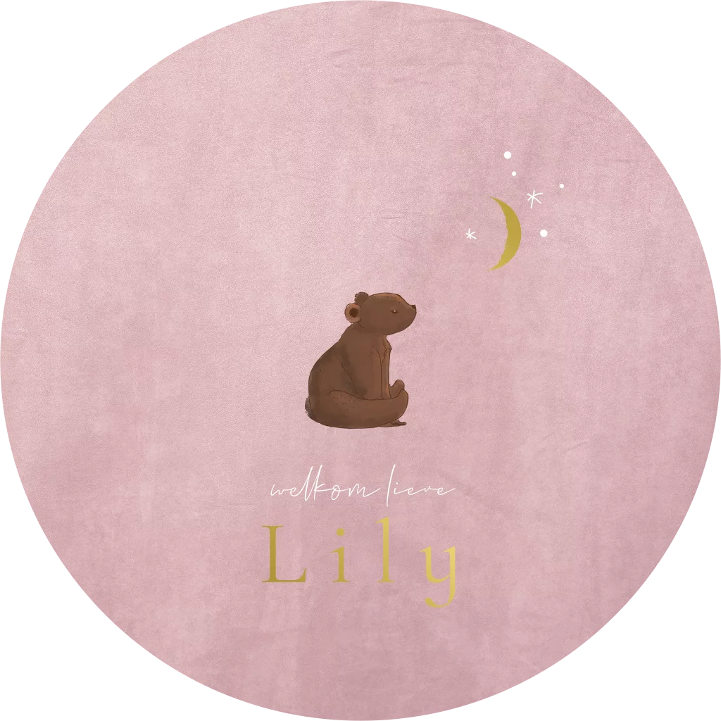 Bijzonder geboortekaartje voor een meisje met een originele cirkel vorm en trend beertje dat naar de maan en sterren kijkt. Met roze velvet achtergrond en goudfolie details. Leuk om extra feestelijk te verzenden met een sluitzegel op maat passend bij het ontwerp.
