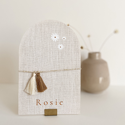Originele stansvorm geboortekaartje voor een meisje met een mooie linnen achtergrond en madelief bloemetjes met een hoogglans folie stipje. Je kan de tassels en het touwtje er los bijbestellen. Dit is een DIY geboortekaartje, je moet zelf even het touwtje met de tassels bevestigen. De babynaam in koperfolie. Liever goudfolie ? dat kan je eenvoudig aanpassen in de ontwerptool. Verstuur het geboortekaartje extra feestelijk met een sluitzegel op maat en kondig de geboorte van jullie dochter aan met een raambord in dezelfde stijl als het geboortekaartje