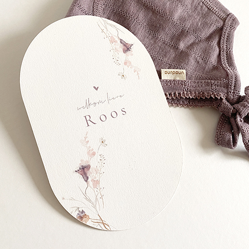Geboortekaartje voor een meisje met bloemen op een neutrale w achtergrond. De bijzondere stans vorm geeft een extra bijzondere uitstraling aan dit geboortekaartje. Wil je liever een ander formaat , dan kan dat natuurlijk ook ! Het babykaartje van jullie dochter kan je extra mooi verzenden met een sluitzegel in dezelfde stijl. Leuk om een bijpassende poster te bestellen voor de babykamer. En een raambord voor de geboorteaankondiging
