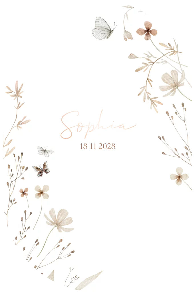 Geboortekaartje rosefolie voor een meisje met bloemen en vlinders