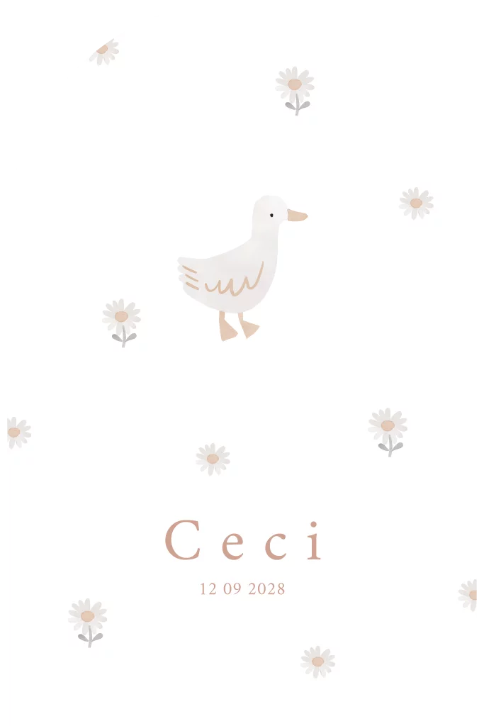 Lief stansvorm geboortekaartje voor een meisje met een schattig eendje en bloemetjes. Alle details en de achtergrond kleur zijn eenvoudig zelf aan te passen met de online editor. Maak de geboorte aankondiging extra feestelijk met een sluitzegel op maat, raambord in boogvorm en een lief kraambezoekboek.