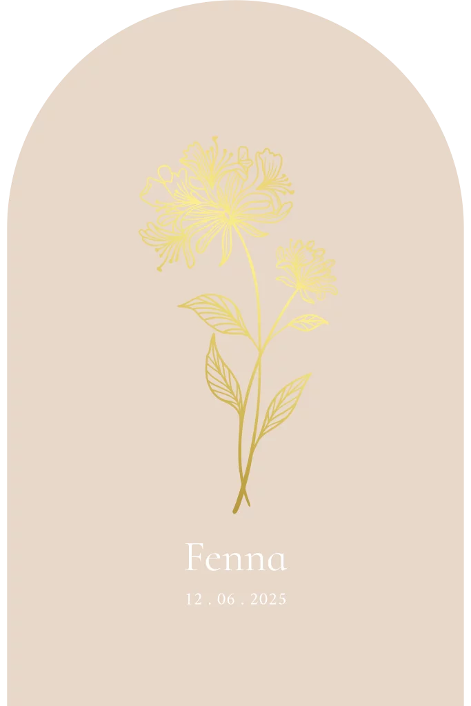 Geboortekaartje voor een meisje met de geboortebloem van juni , Kamperfoelie. Dit ontwerp heeft een bijzondere vorm - die kan natuurlijk aangepast worden naar een ander formaat. Alle geboortebloemen staan in de ontwerptool, je kan dit ontwerp zelf aanpassen met de bloem voor jullie kindje. De goudfolie naam op een zacht roze achtergrond is stijlvol en lief. Leuk om een bijpassende poster te bestellen voor de babykamer.