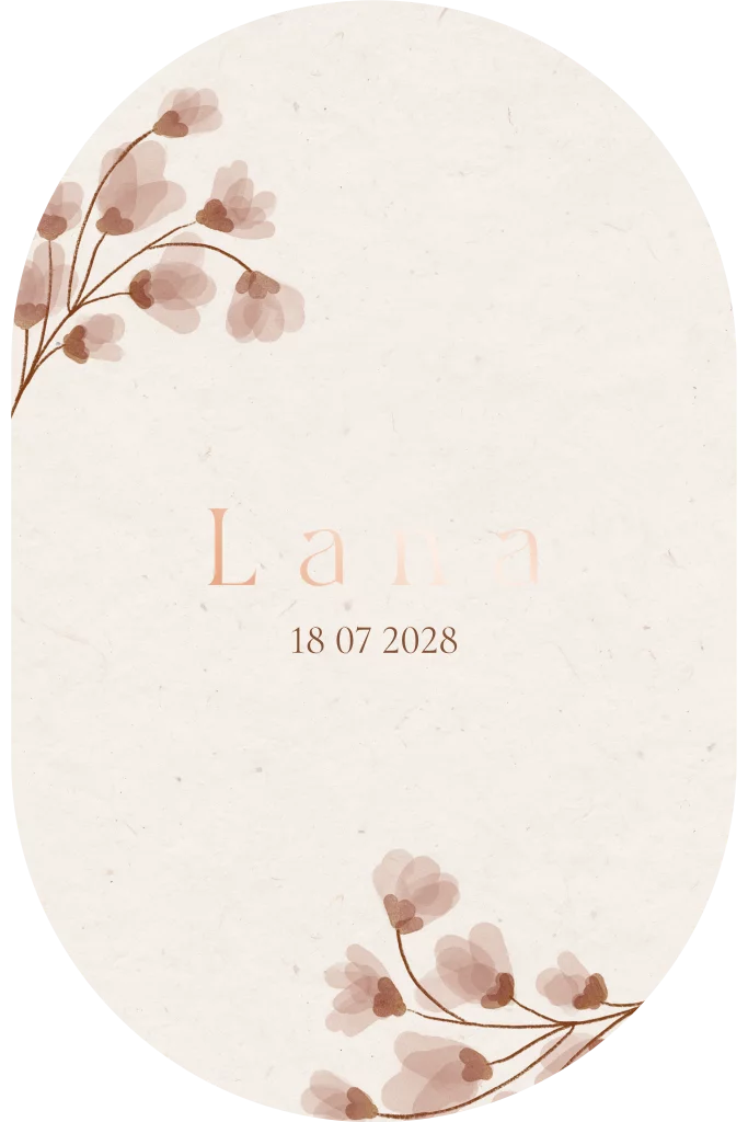 Geboortekaartje voor een meisje mooie bloemen op een vezellook achtergrond.In een ovale vorm . Rosefolie voor een extra luxe uitstraling. Wil je liever een ander formaat , dan kan dat natuurlijk ook ! Mooi verzenden doe met een sluitzegel in dezelfde stijl. En leuk om een bijpassende poster te bestellen voor de babykamer.