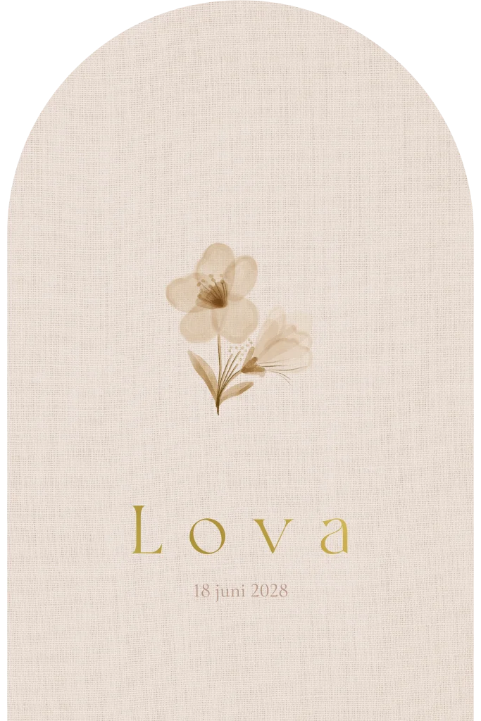 Zomers geboortekaartje met boogvorm voor een meisje met een klassieke linnen achtergrond en mooie bloem. In neutrale kleuren voor een tijdloos ontwerp. Wil je graag rosefolie in plaats van goudfolie? dat kan je eenvoudig aanpassen in de ontwerptool. Meer mooie bloemetjes kan je vinden in de beeldbank. Op de achterkant staat een lief geboortegedichtje.