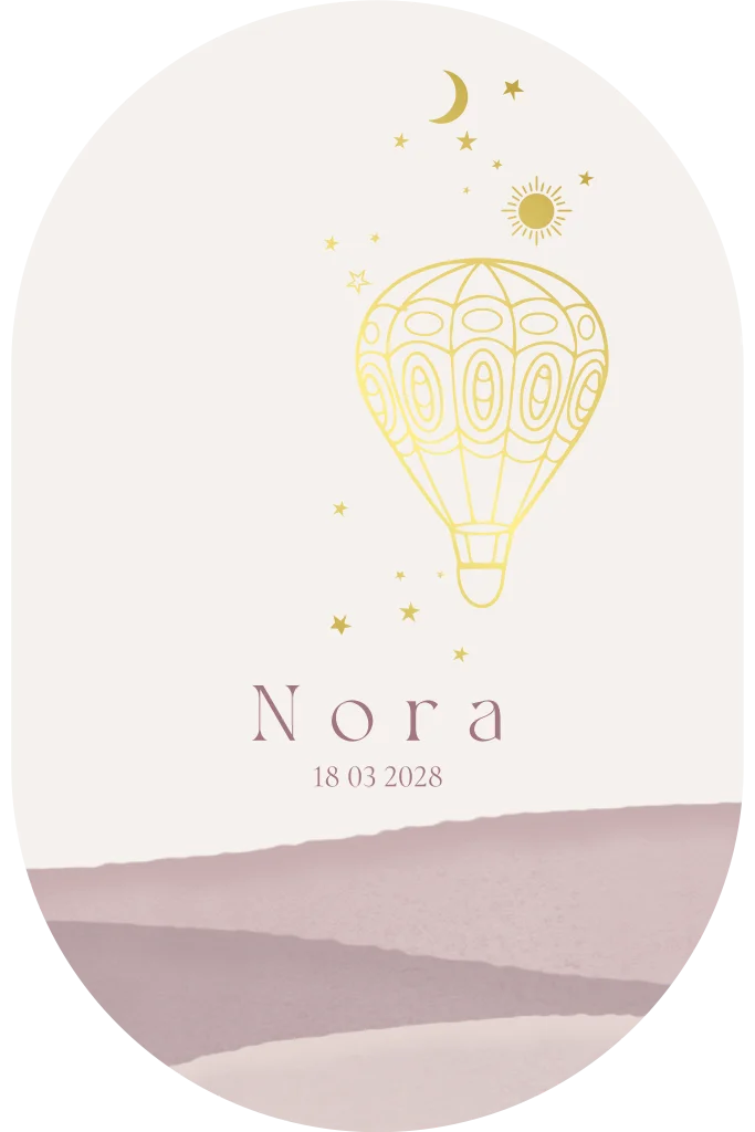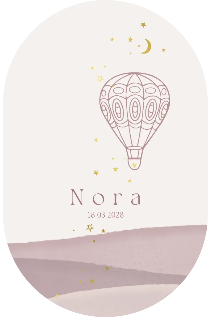 Een geboortekaartje met een luchtballon heeft altijd een sprookjes achtige uitstraling. Perfect geboortekaartje voor een meisje. Lief met de trendkleuren roze en lila en mooi in combinatie met goudfolie. De originele ovale stans vorm geeft een luxe uitstraling aan dit geboortekaartje. Wil je liever een ander formaat , dan kan dat natuurlijk ook ! Leuk om een bijpassende canvasposter te bestellen voor de babykamer.