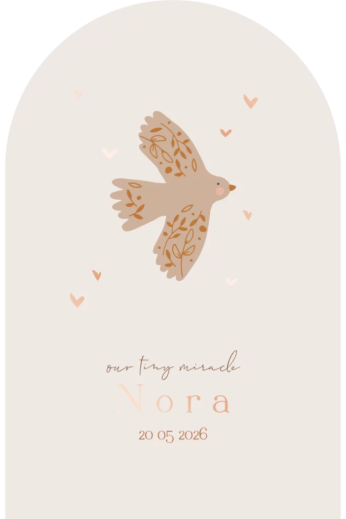 Lief geboortekaartje met een vogel en hartjes in foliedruk voor een meisje. Het vogeltje met bloemetjes in leuk voor een lente kindje. Er staan nog meer details in de beeldbank. Je kan zelf het geboortekaartje personaliseren in de online editor. In neutrale kleuren voor een tijdloos ontwerp. Wil je graag goudfolie toevoegen ? dat kan je eenvoudig aanpassen in de ontwerptool. Op de achterkant staat een originele geboortegedichtje.