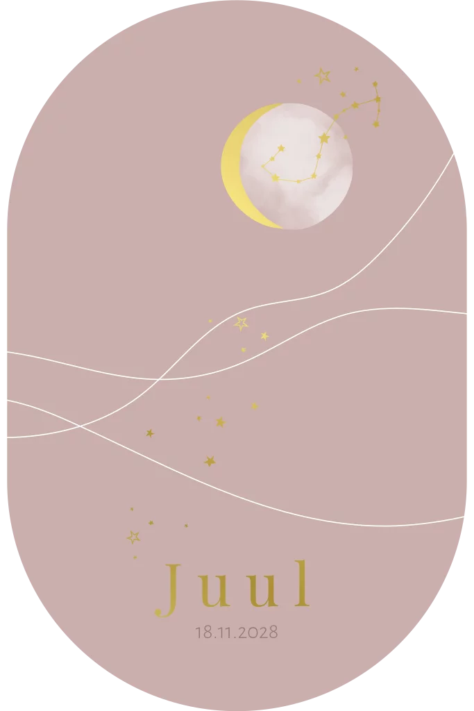 Origineel geboortekaartje met sterrenbeeld voor een meisje met folie en een zacht lila trendkleur achtergrond. De goudfolie maan in met sterretjes op de voorkant is lief en uniek. Je kan zelf het sterrenbeeld passend bij de geboortedatum van jullie kindje in het ontwerp plaatsen. Leuk met bijpassend raambord om de geboorte van jullie dochter aan te kondigen. En een geboorte tegeltje of poster staat ook voor je klaar om de babykamer mee te versieren.