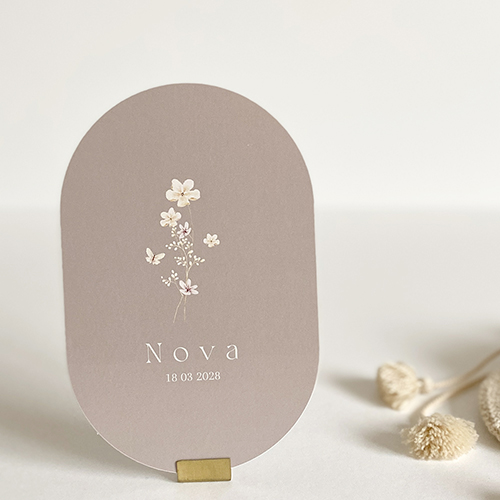 Geboortekaartje met bloemen en een vlinder voor een meisje. Met een neutrale achtergrond kleur. De originele ovale stans vorm geeft een luxe uitstraling aan dit geboortekaartje. Wil je liever een ander formaat , dan kan dat natuurlijk ook ! Mooi verzenden met een sluitzegel in dezelfde stijl. Leuk om een bijpassende poster te bestellen voor de babykamer.