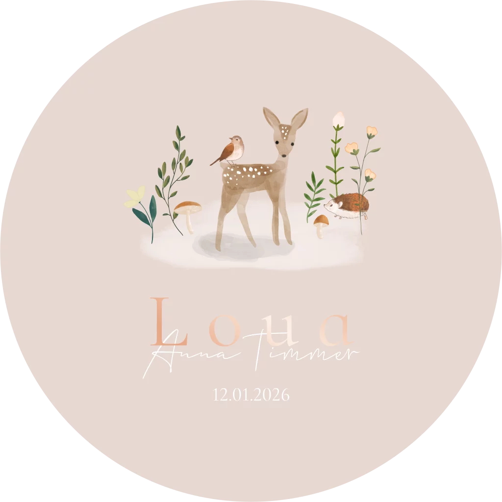 Origineel geboortekaartje voor een meisje met trend bosdieren. Lief met een hertje egel en vogeltje. Je kan eenvoudig de teksten, illustraties en foliekleur aanpassen in de ontwerptool. En de geboorte van je dochter kan je extra feestelijk aankondigen met een raambord of vlag in de stijl van het geboortekaartje.