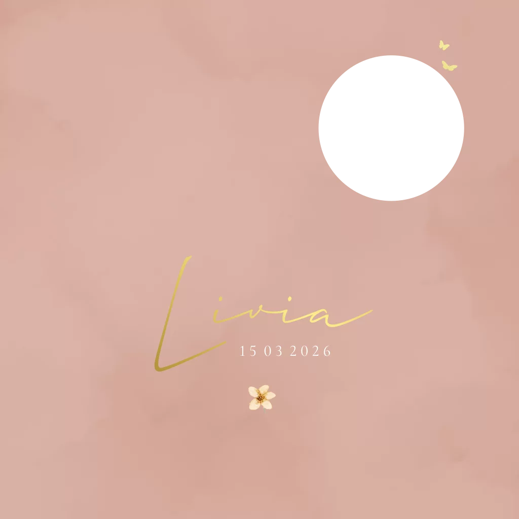 Lief geboortekaartje voor een meisje met een cirkel stans doorkijkje op de voorkant. Je ziet het hertje met vogeltje en bloemen takje, op de binnenkant staat er een lief geboortegedichtje bij. De achtergrond heeft een velvet look aardetint, liever een uni kleur ? Dat is eenvoudig aan te passen in de editor.