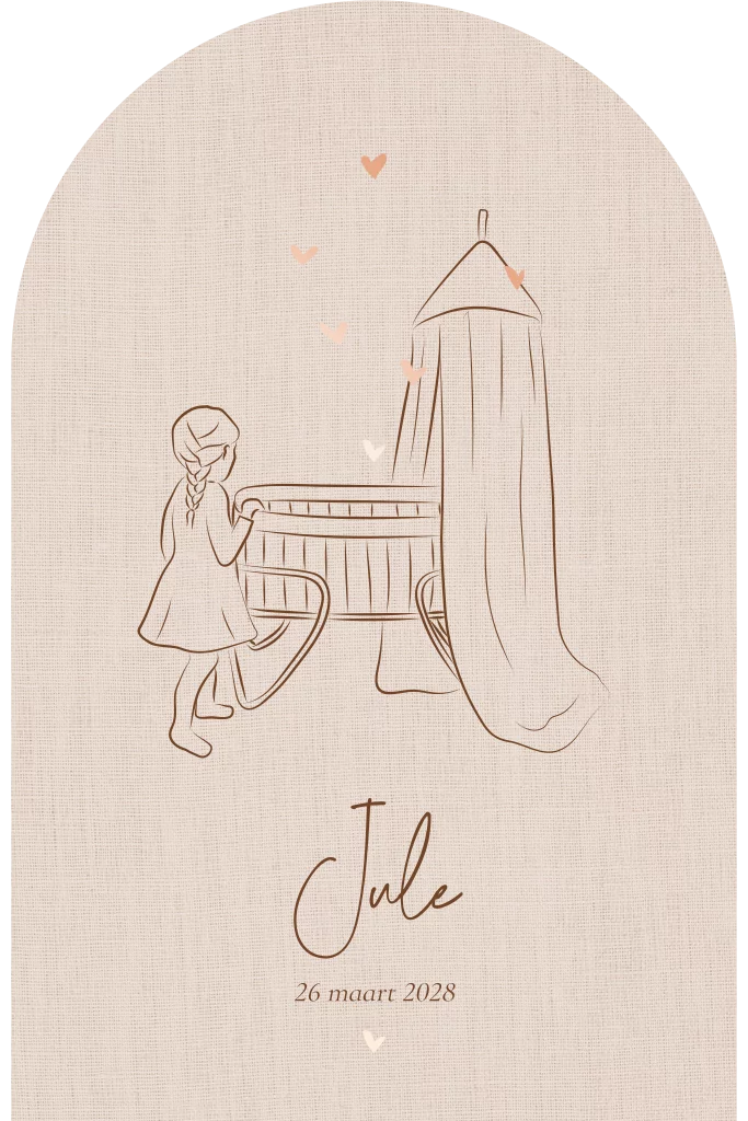 Dit mooie stans geboortekaartje heeft een linnenlook achtergrond en een tekening van grote zus met baby in een wiegje. Minimalistische lijntekening met lieve rosefolie hartjes en een illustratie van een baby op de achterkant. De geboorteaankondiging heeft een persoonlijke en unieke uitstraling met een lijntekening op maat. Graag nog een broertje of zusje erbij? Neem even contact met ons op. Originele collectie geboortekaartjes waar je een lijntekening op maat , door Bambeloe geillustreerd, in kan laten zetten door Zo Mooi. Je kan hier alle informatie vinden. Neem gerust contact met ons op als je vragen hebt.