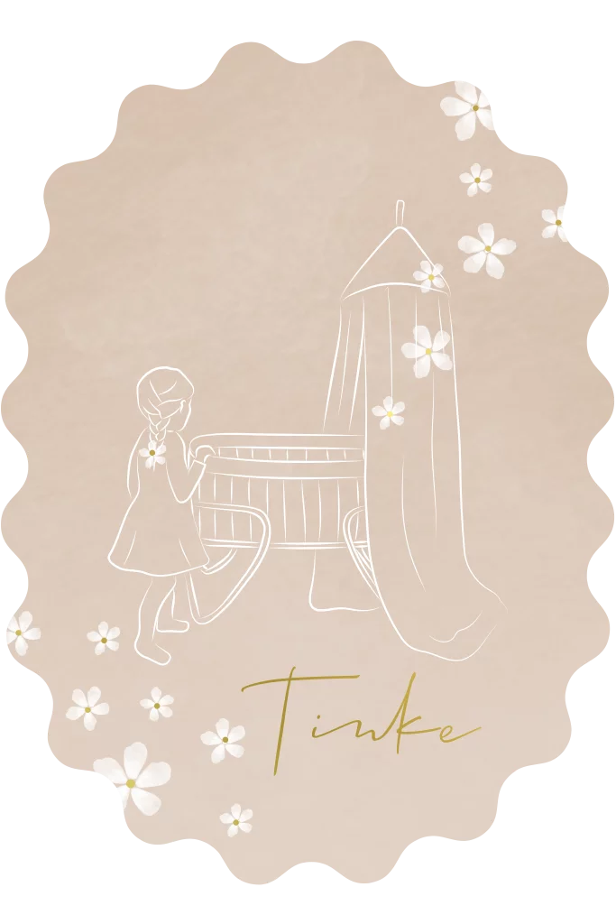 Originele vorm geboortekaartje voor een meisje met een lijntekening wiegje en zusje op een neutrale kleur achtergrond met bloemen en goudfolie stipjes. Je kan eenvoudig de tekst en het lettertype aanpassen. Wil je een aanpassing in de tekening ? Geef je wensen door en wij passen het gratis voor je aan. Dit ontwerp kan worden omgezet naar een ander formaat. Je kan de sluitzegels en het raambord in dezelfde stijl als het geboortekaartje vooraf bestellen. Leuk een poster op canvas voor de babykamer. Je kan ook kiezen voor een lijntekening op maat , neem daarvoor even contact met ons op !