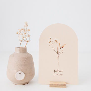 Originele stansvorm geboortekaartje voor een meisje met een neutrale kleur achtergrond en mooie herfst bloemen illustratie. Je kan het kaartje eenvoudig zelf aanpassen in de ontwerptool !