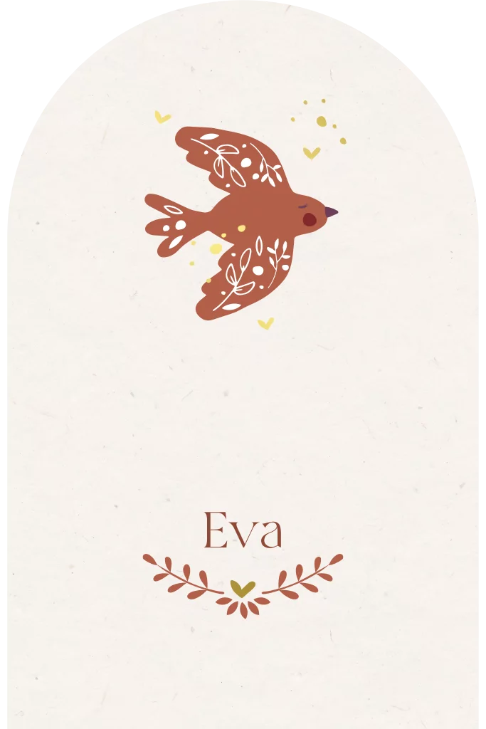 Vrolijk zonnig geboortekaartje met een kleurrijke vogel en goudfolie hartjes voor een meisje. Op de achterkant staat een originele tekst en geboortegedichtje. Leuk om te combineren met een sluitzegel op maat en een geboortebord in de stijl van het geboortekaartje.