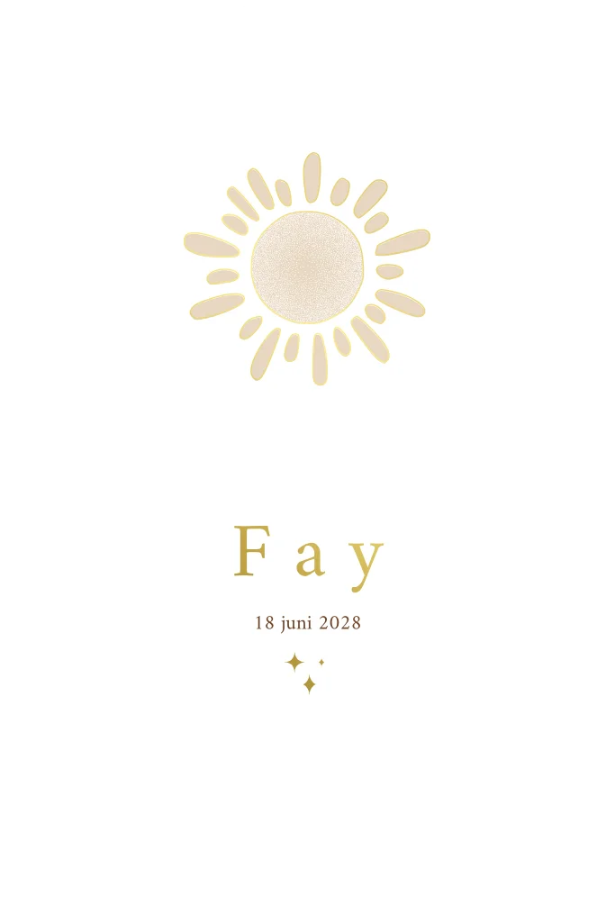Bijzonder geboortekaartje voor een meisje met een originele stansvorm. De goudfolie zon met zonnestralen en sterretjes is neutraal. Wil je liever een ander formaat ? neem dan gerust contact met ons op en wij zetten die klaar in je account. Extra feestelijke aankondiging met een raambord passend bij het geboortekaartje en natuurlijk een sluitzegel voor de envelop.