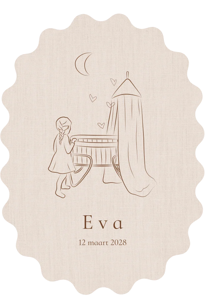Minimalistisch neutraal geboortekaartje voor een jongen of meisje met een lijntekening wiegje en zusje op een neutrale kleur achtergrond. Je kan eenvoudig de tekst en het lettertype aanpassen. Wil je een aanpassing in de tekening ? Geef je wensen door en wij passen het gratis voor je aan. Je kan de sluitzegels en het raambord in dezelfde stijl als het geboortekaartje vooraf bestellen. Leuk ook een poster op canvas voor de babykamer. Je kan ook kiezen voor een lijntekening op maat , neem daarvoor even contact met ons op !
