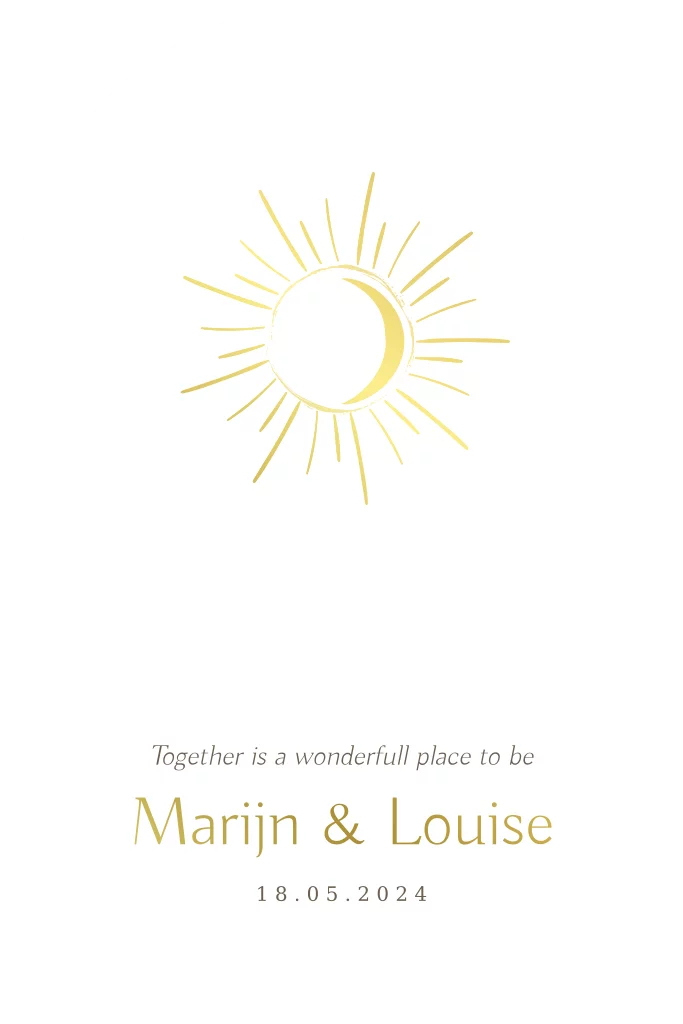 Luxe trouwkaart in originele vorm met goudfolie zon en maan. Deze hippe uitnodiging is mooi te combineren met de bijpassende Safe the Date kaart en maak de dag compleet met de huisstijl menukaart, naamkaart en bedankje. Wil je liever koperfolie of een andere achtergrondkleur? dat is eenvoudig aan te passen in de ontwerptool. Hulp nodig? Neem gerust contact op.