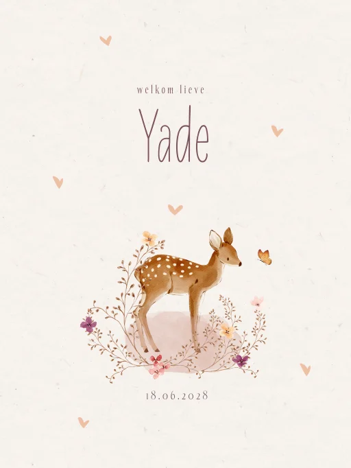 Mooie canvasposter voor een meisje met hertje, vogeltje en bloemen. Persoonlijk en bijzonder voor de babykamer in de stijl van het geboortekaartje. Tip: zet deze op je kraamcadeau verlanglijstje !