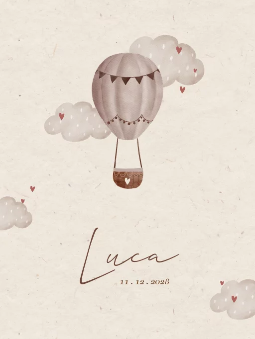 Stoere canvasposter voor een jongen met luchtballon , hartjes en wolkjes. Heel leuk voor de babykamer in de stijl van het geboortekaartje.