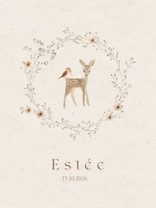 Vrolijke canvasposter voor een meisje met hertje, vogeltje en bloemen. Heel mooi voor de babykamer in de stijl van het geboortekaartje.