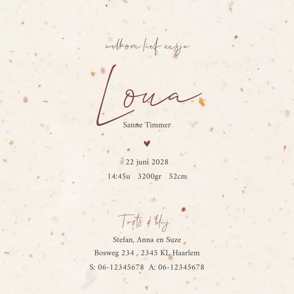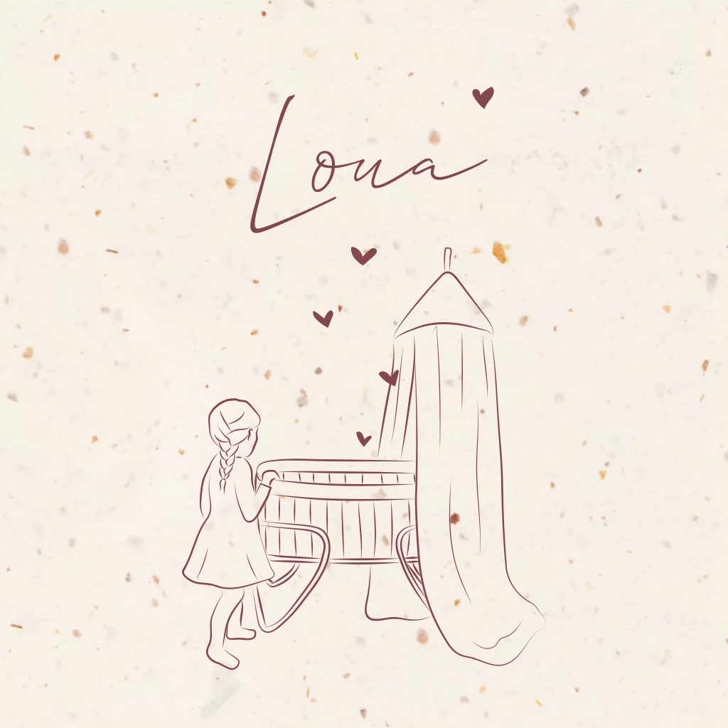 Originele collectie geboortekaartjes waar je ook een lijntekening op maat , door Bambeloe geillustreerd, in kan laten zetten door Zo Mooi. Je kan hier alle informatie vinden. Dit mooie geboortekaartje heeft een linnen achtergrond en een tekening van grote zus met zusje. Je kan een dit ontwerp zelf aanpassen met de online ontwerptool. De geboorteaankondiging heeft een persoonlijke en unieke uitstraling met een lijntekening op maat. Neem gerust contact met ons op als je vragen hebt.