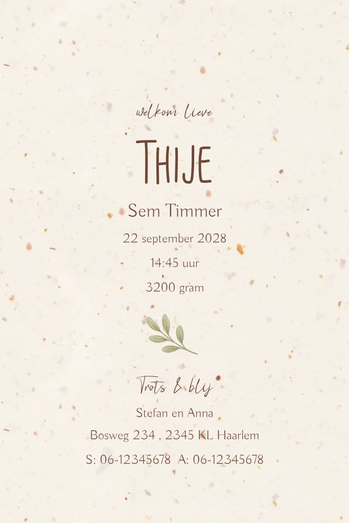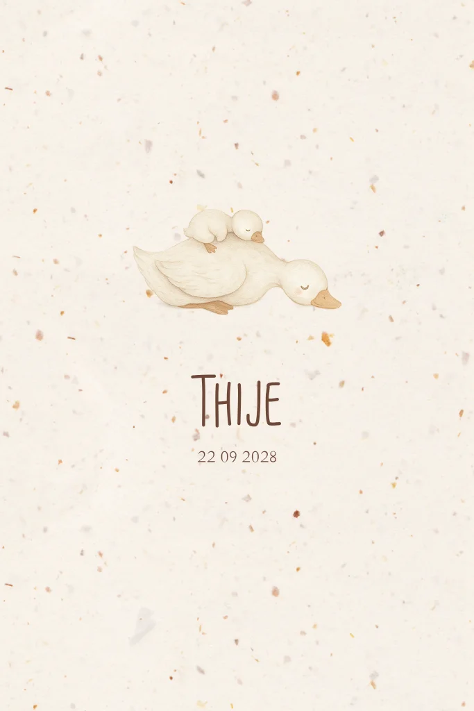 Neutraal duurzaam geboortekaartje voor een jongen met een gansje op echt tulpenpapier. De kleur van de teksten is in de stijl passend bij de uitstraling van het ecopapier. Je kan zelf de details naar wens aanpassen met de eenvoudige online editor. Mooi met een bijpassende sluitzegel in de stijl van het geboortekaartje en natuurlijk met een raambord voor de aankondiging van de geboorte van jullie kindje.