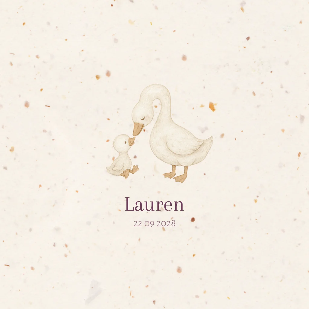 Neutraal geboortekaartje voor een meisje met een gansje op de voorkant, gedrukt op echt duurzaam tulpenpapier. Origineel en bijzonder met het lieve geboortegedichtje op de binnenkant. Elk geboortekaartje heeft een unieke uitstraling. Je kan eenvoudig zelf de teksten en afbeeldingen aanpassen. Tip: Bestel een bijpassend raambord voor de geboorteaankondiging. Leuk met een sluitzegel in dezelfde stijl.