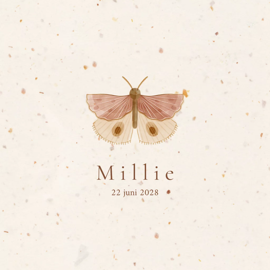 Duurzaam geboortekaartje meisje met vlinder op tulpenpapier