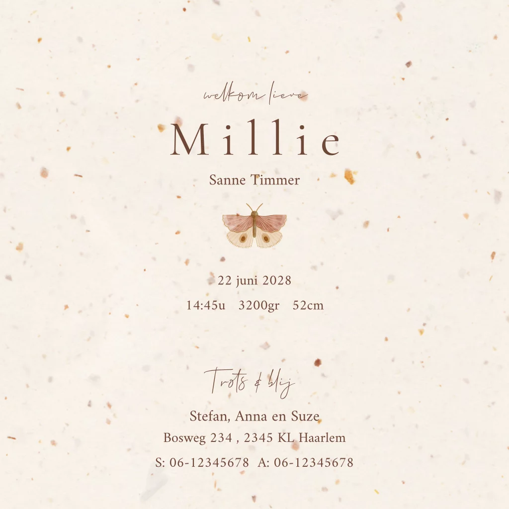 Lief geboortekaartje voor een meisje met een vlinder op de voorkant, gedrukt op echt duurzaam tulpenpapier. Origineel en bijzonder met het mooie vlindertje en het lieve geboortegedichtje op de binnenkant. Bestel ook een bijpassend raambord voor de geboorteaankondiging.