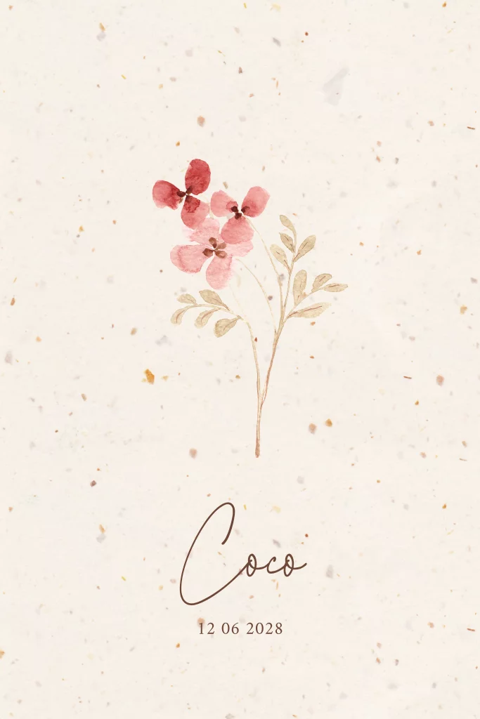 Duurzaam geboortekaartje met bloemen voor een meisje