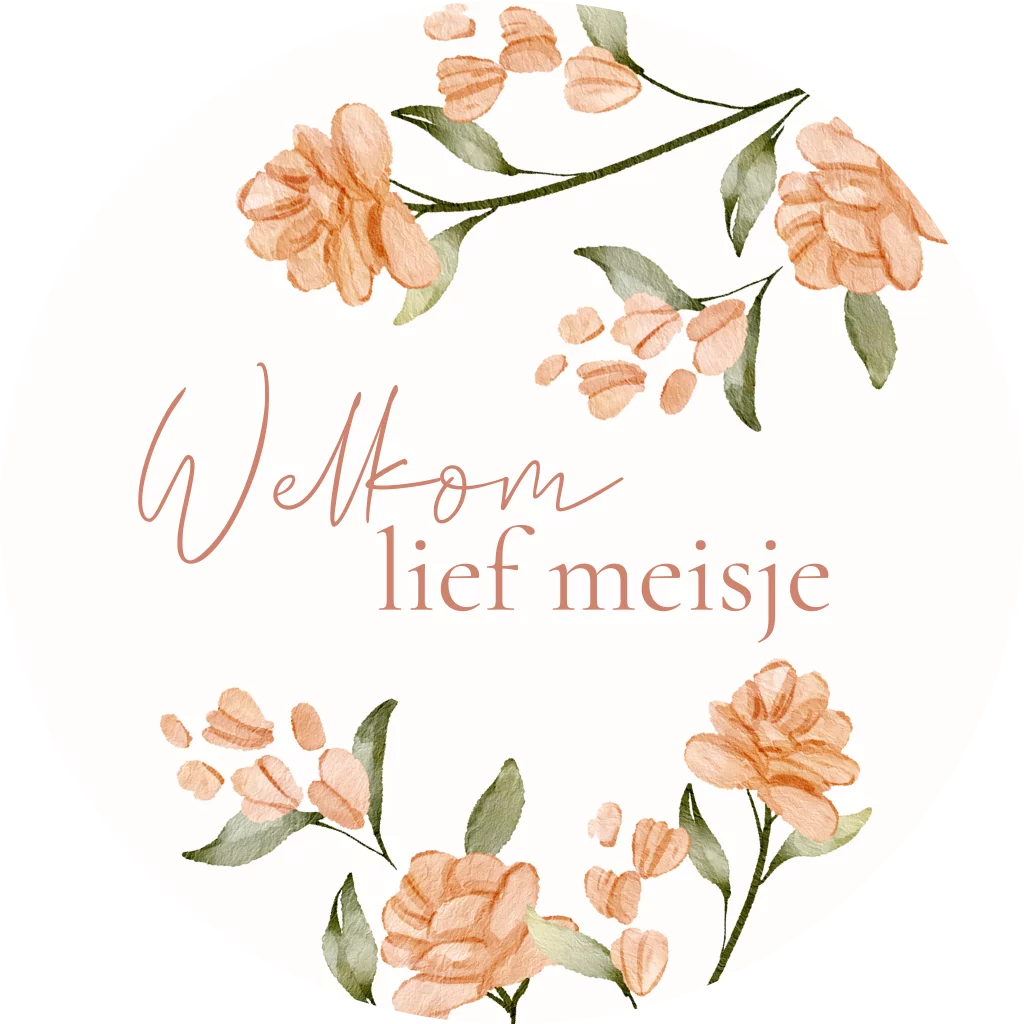 Sluitzegel welkom lief meisje met mooie bloemen passend bij het geboortekaartje. Mooi om de envelop mee te versieren en ook voor doopsuiker. Je kan eenvoudig de tekst aanpassen.