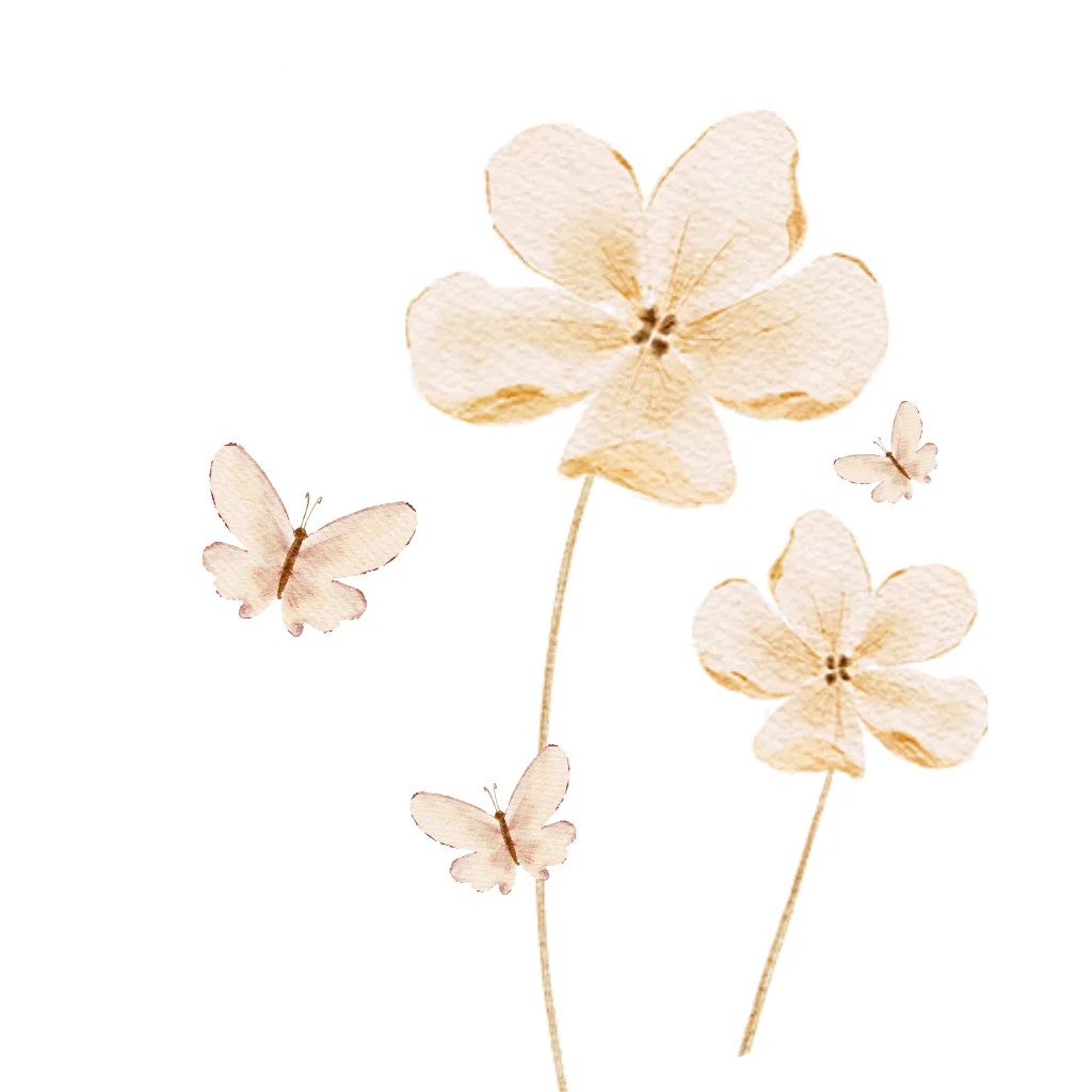 Sluitsticker met bloemen en vlinders, passend bij het geboortekaartje voor een meisje. De sluitstickers hebben een diameter van 35 mm en worden geleverd op vellen van 25 stuks.