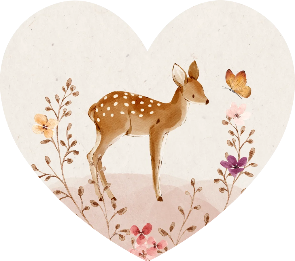 Een schattige sluitzegel in de vorm van een hartje met daarop een hertje, bloemen en een vlindertje. Deze past mooi bij het geboortekaartje voor een meisje in dezelfde stijl.