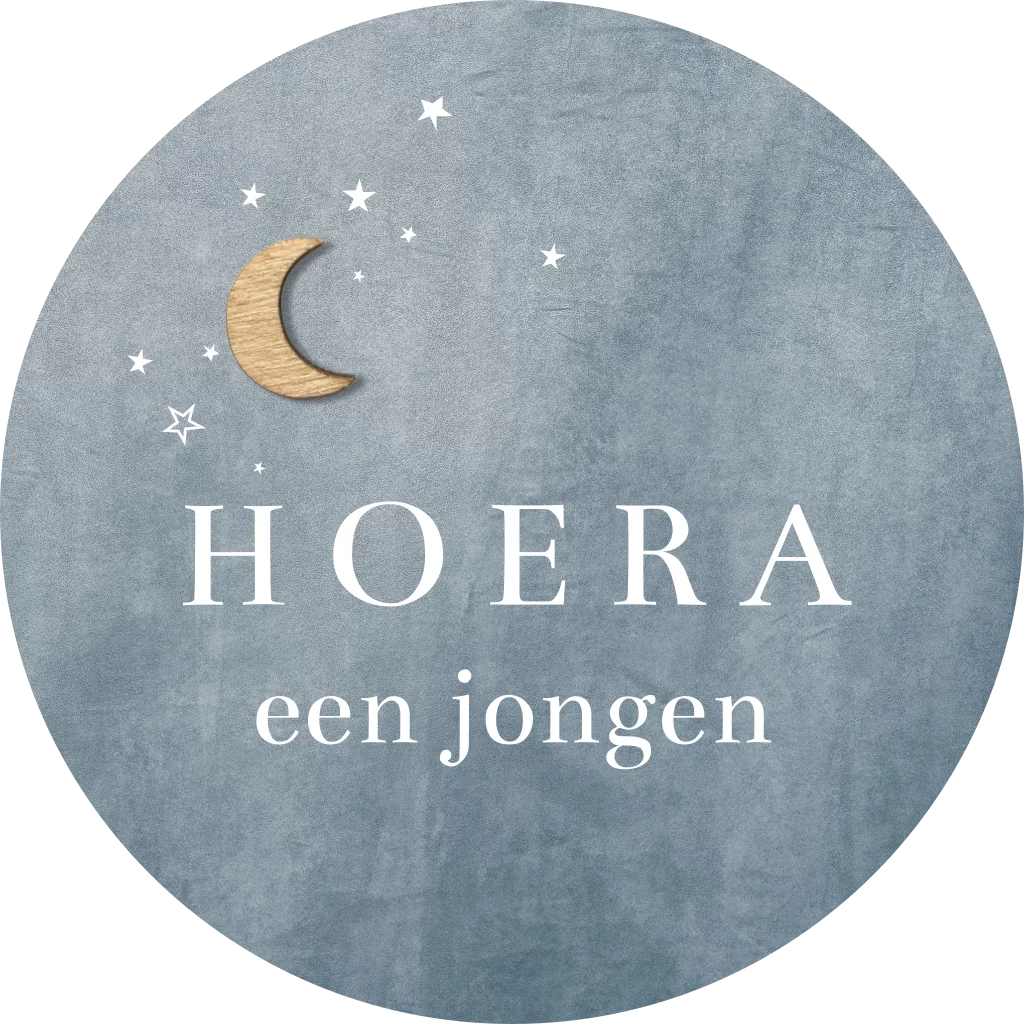Stoere sluitzegel voor een jongen met blauw velvet look achtergrond passend bij het geboortekaartje. Het hout maantje is gedrukt voor een extra leuk effect. je kan eenvoudig de tekst aanpassen op de sticker. Ook leuk als doopsuiker.