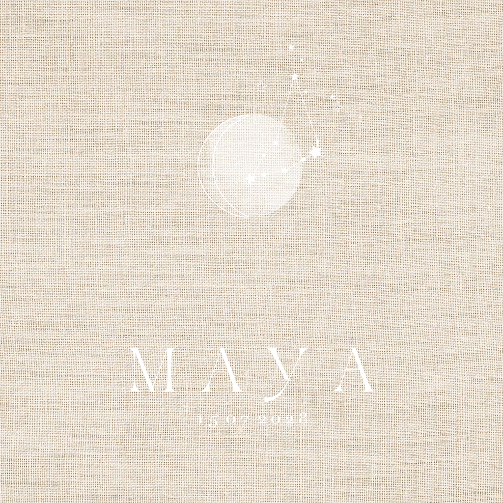 Origineel geboortekaartje sterrenbeeld voor een meisje. Met goudfolie babynaam op een linnen achtergrond. Neutraal geboortekaartje. Je kan zelf de details en het juiste sterrenbeeld aanpassen in de ontwerptool en met illustraties uit de mappen.