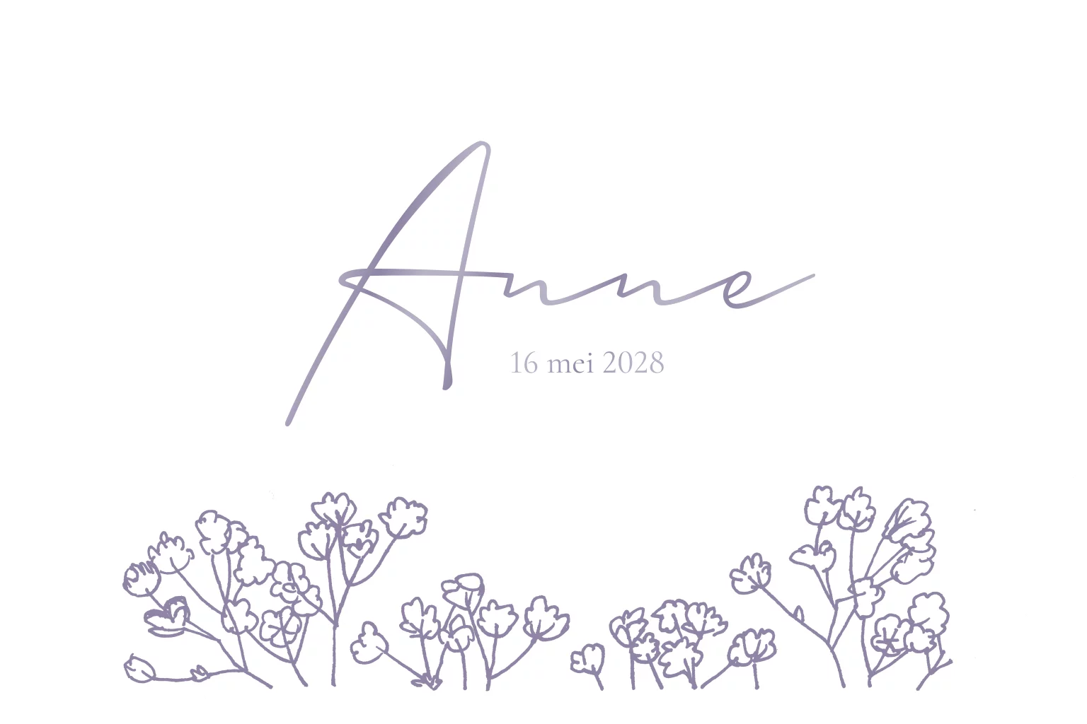Mooi geboortekaartje voor een meisje met de bloemen in getekende stijl. De hoogglans in trendkleur lila is eenvoudig aan te passen naar een andere kleur. Verzend het geboortekaartje extra feestelijk met een sluitzegel op maat.