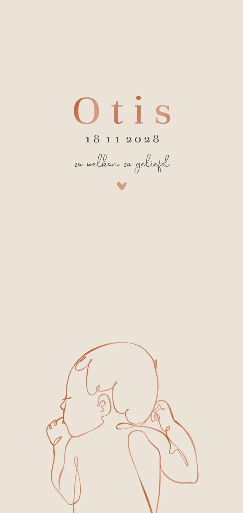 Lief, tijdloos en hip geboortekaartje voor een jongen met een baby illustratie in koperfolie. De rest van het ontwerp is clean en minimalistisch voor een maximale uitstraling. Je kan zelf de folie kleur aanpassen. Soft touch velvet papier past hier ook mooi bij.