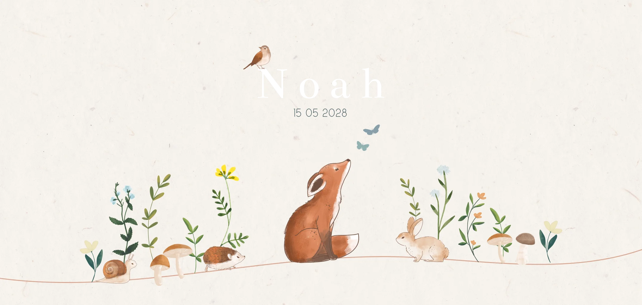 Origineel geboortekaartje met bloemen en bosdieren illustraties voor een jongen. Het vosje, egeltje vogeltje konijn en slakje maken het kaartje extra bijzonder en lief. De dieren staan ook in de illustratie mappen. Je kan de gegevens aanpassen en zo zelf je geboortekaartje ontwerpen.De babynaam in hoogglans folie koperkleur geeft het geboortekaartje een luxe uitstraling. Ook mooi als poster voor de babykamer !